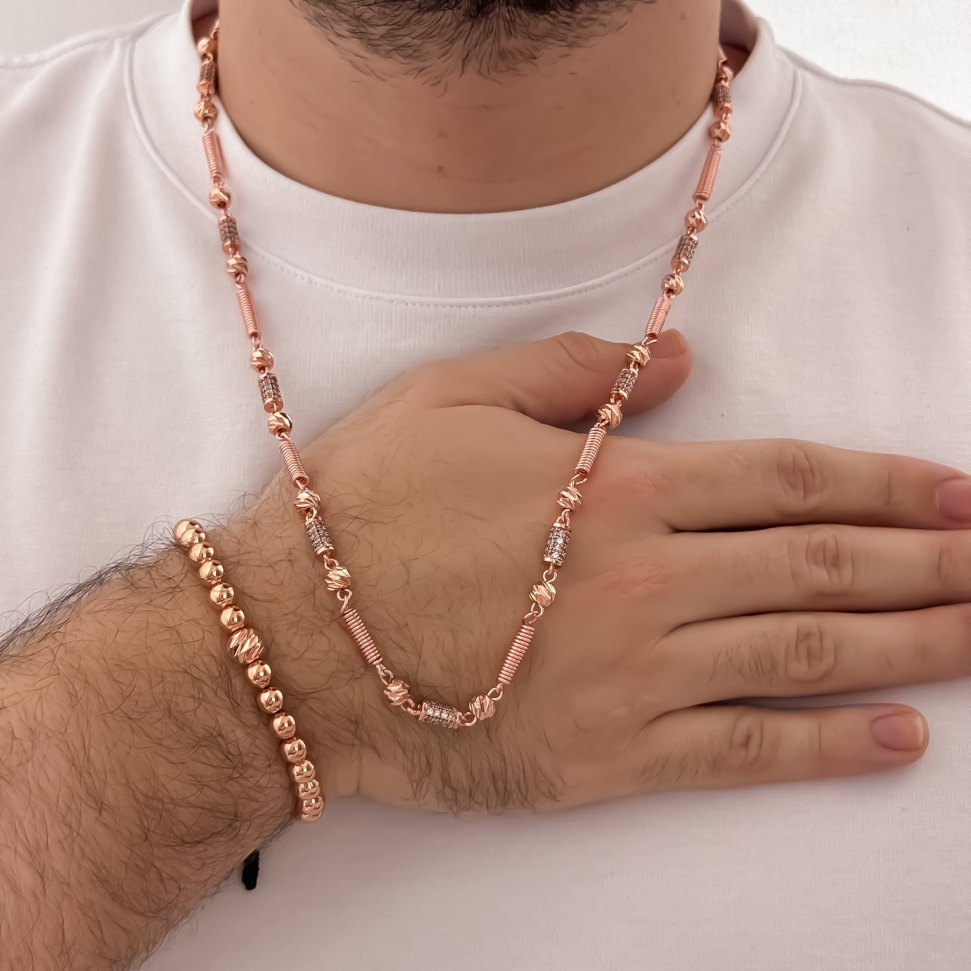 Cadena Rústica Diamantada de 60cm, 5mmPulsera en Balín Liso de 4mmColor: Oro Rosado Premium (igual al oro 18K real)Un diseño que llama la atención de forma elegante, moderna y masculina.
