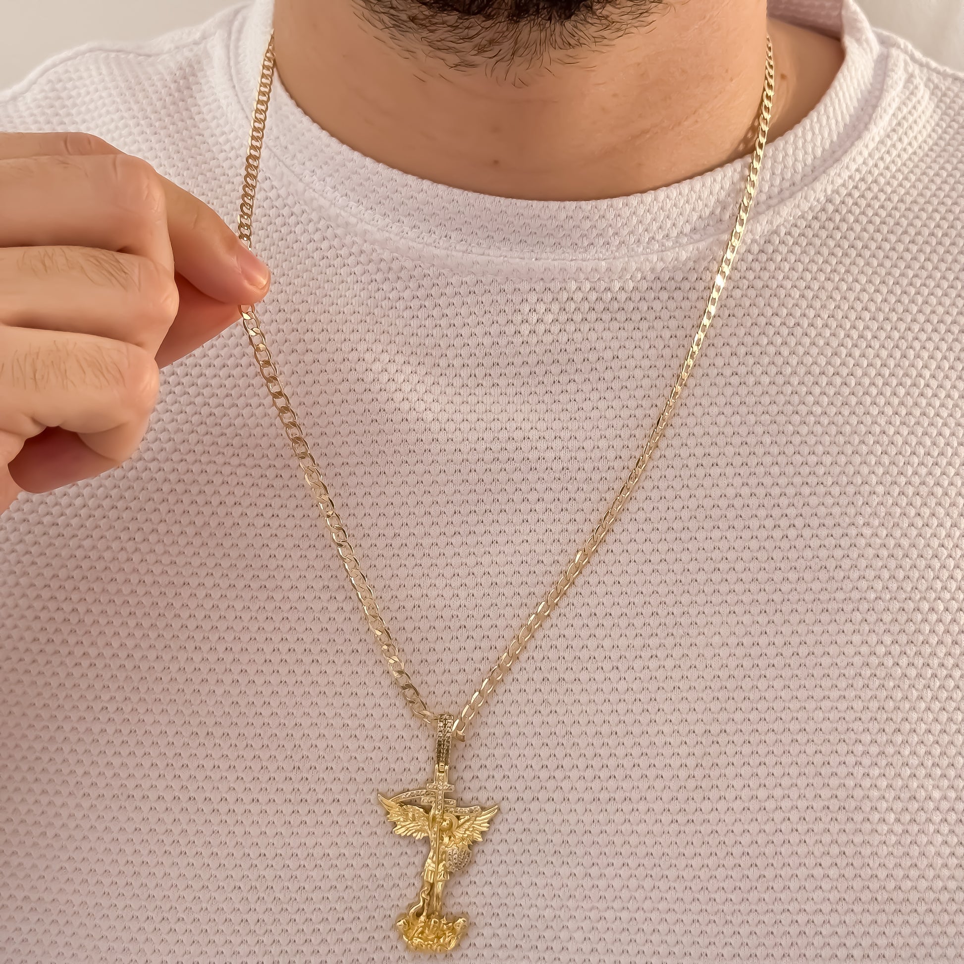 Cadena Tejido Cubana de Hombre de 60cm de 4mm + San Miguel Arcangel Tallado con Micro circones en Oro Laminado 18k con Garantia de por vida