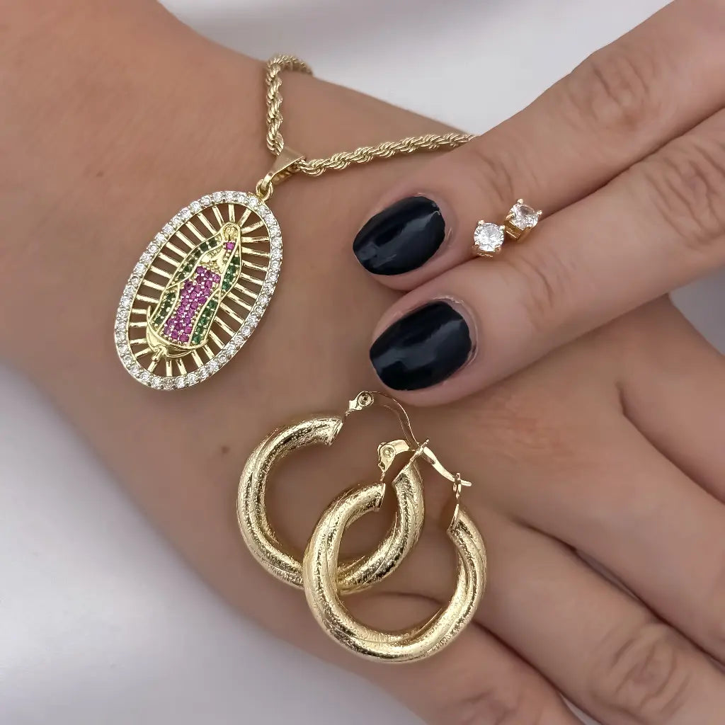 Cadena Tejido Lazo de Dama de 45cm de 3mm de Grosor + Virgen Guadalupe + Topo con micro circones + Candongas Tubular en Oro Laminado 18k con Garantia de por vida
