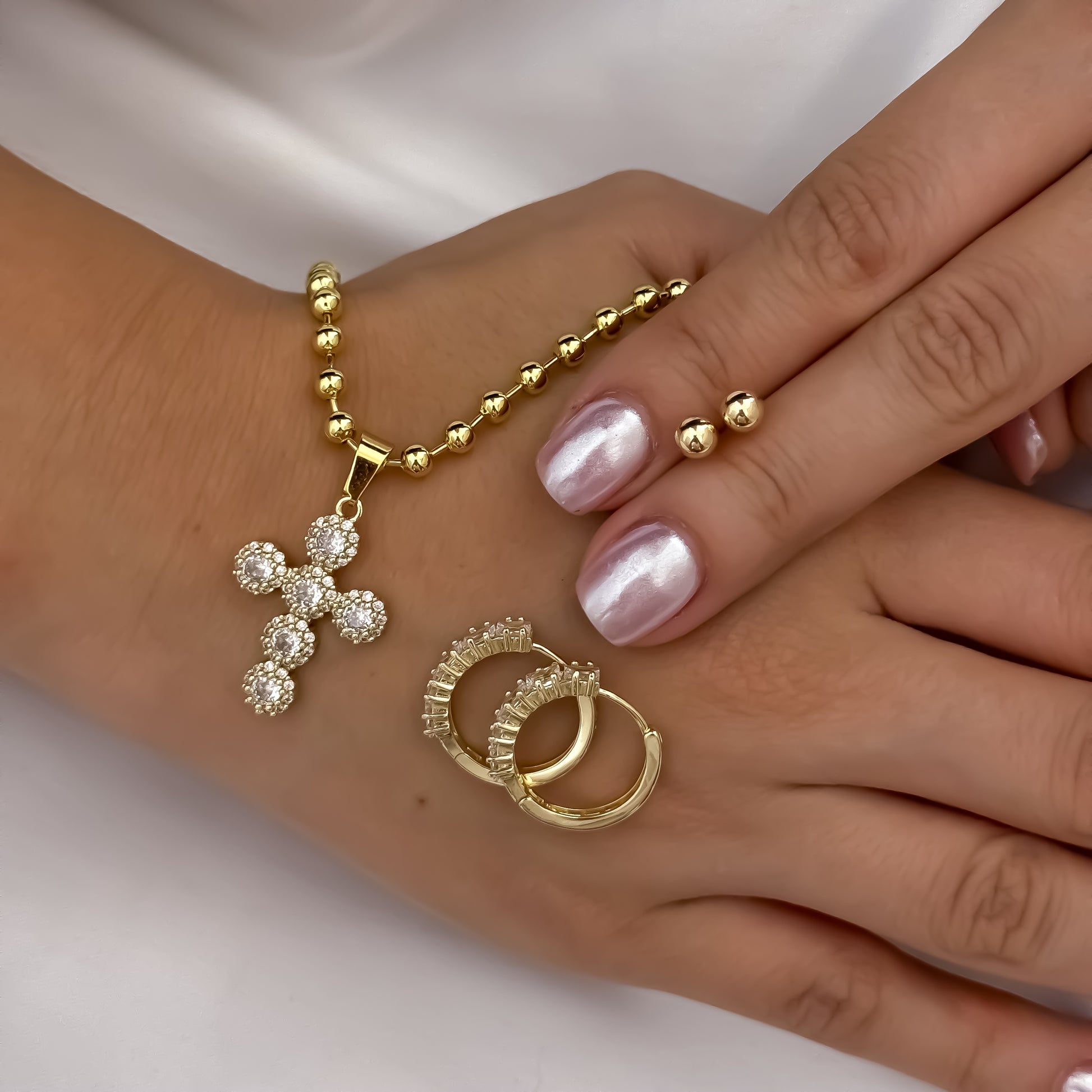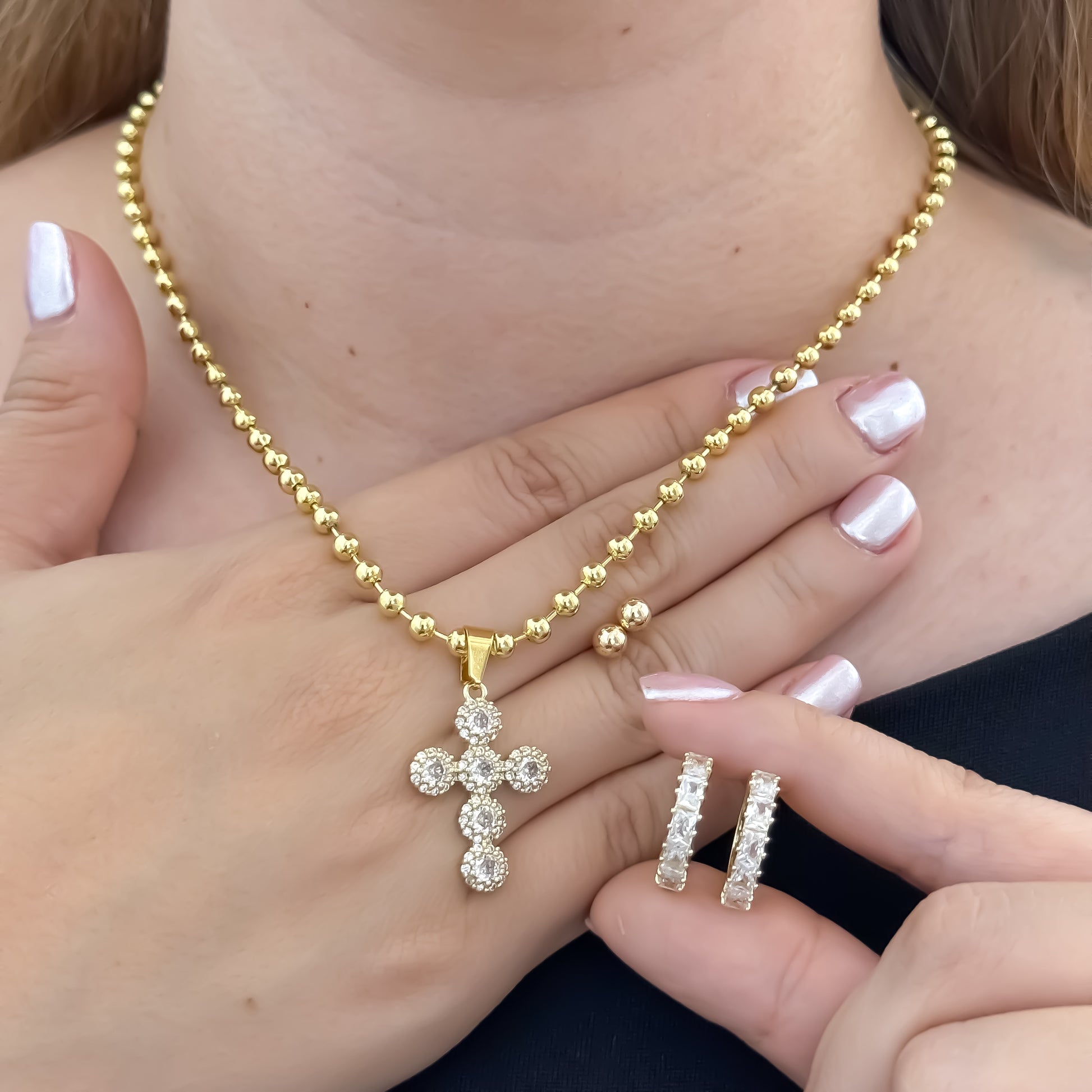 Cadena Tejido Militar de Dama de 45cm + Cruz con Micro circones + Candongas Micro circones Cristales + Topo Balin de 5mm en Oro Laminado 18k con Garantia de por vida