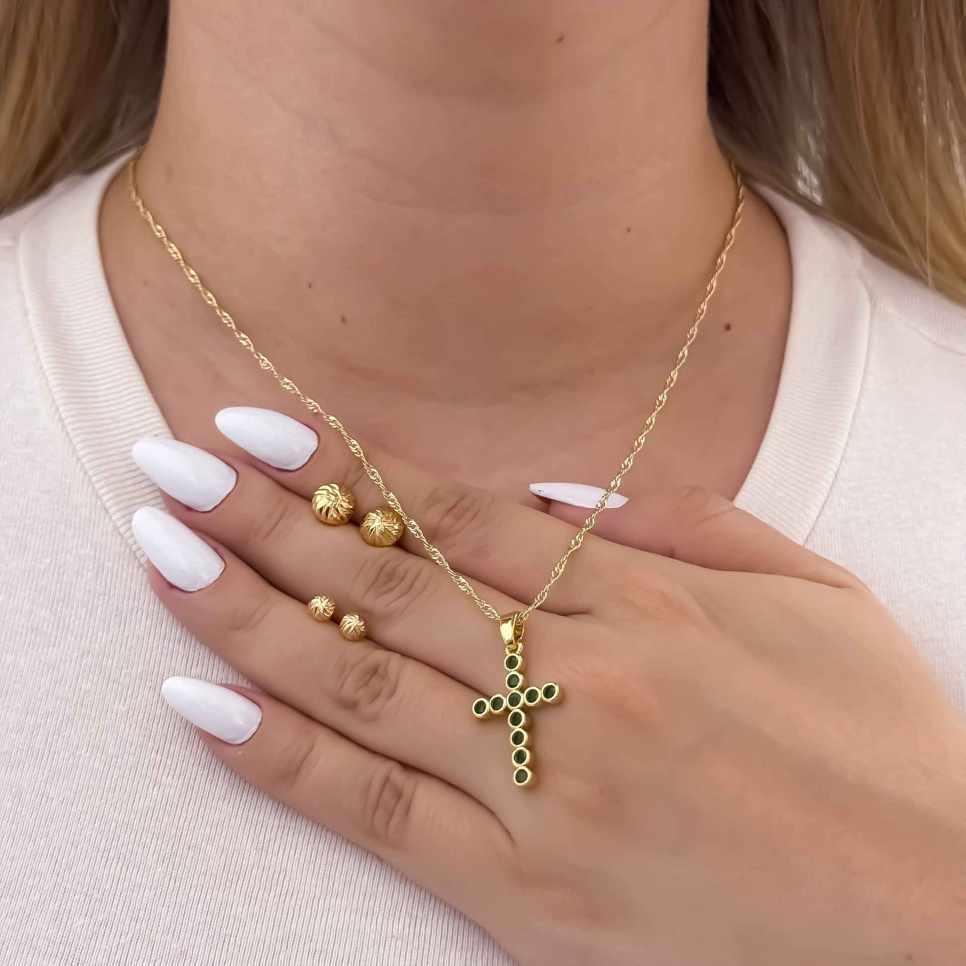 Cadena Tejido Singapur de Dama de 45cm + Cruz Verde Esmeralda + Par de Topo Balin Italiano de 8mm - 6mm en Oro Laminado 18k con Garantia de por vida