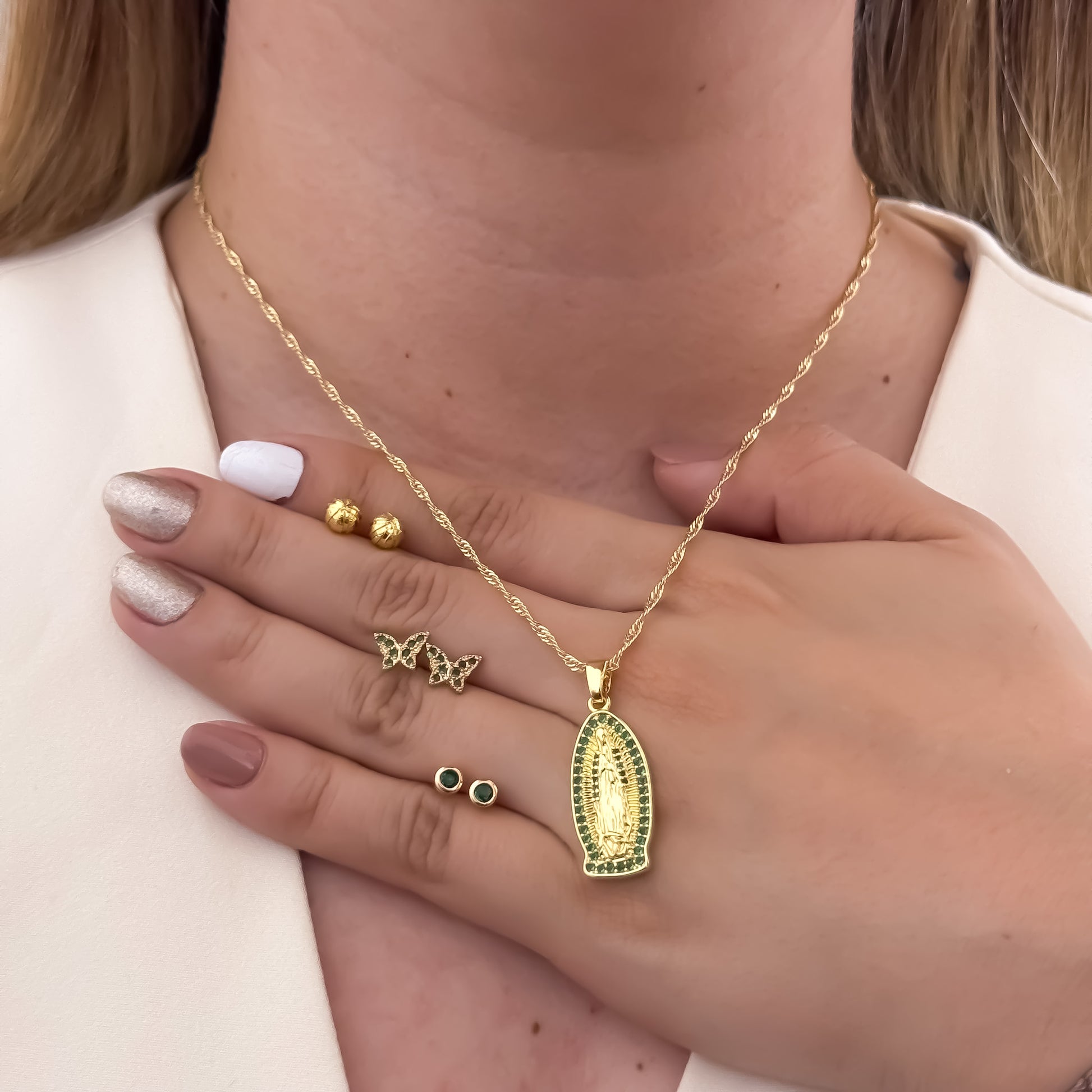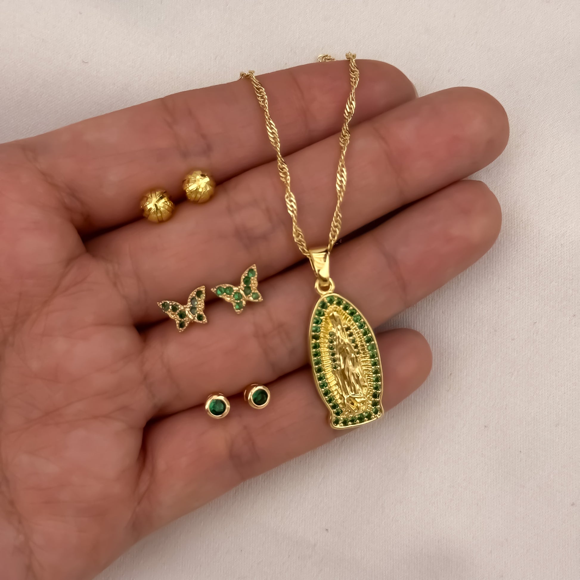 Conjunto Para Dama Cadena Tejido Catier de 45cm + Virgen de Guadalupe Verde + Trio de Topos Topo Balin , Mariposa Verde y Topos Verde Esmeralda en Oro Laminado 18k con Garantía de por vida