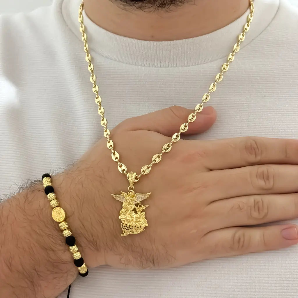 Juego Protección San Miguel Cadena Tejido Gucci 60cm + Dije San Miguel con Micro Circones + Pulsera San Miguel Balin Diamantado 4mm en Oro Laminado 18k con Garantia de por vida