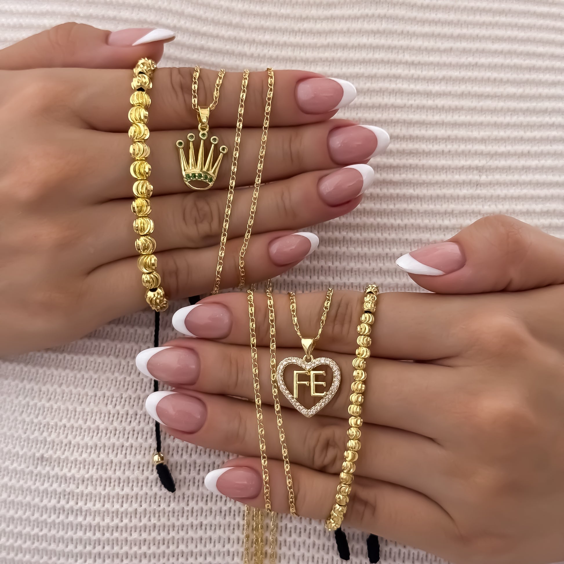 Promocion de 2 Cadenas para Parejas en Tejido Caracol de Dama + Dije de Corazon FE + Cadena de Hombre de 60cm + Corona Rolex + 2 Pulseras Balin Italiano de 6mm - 4mm en Oro Laminado 18k con Garantia de por vida