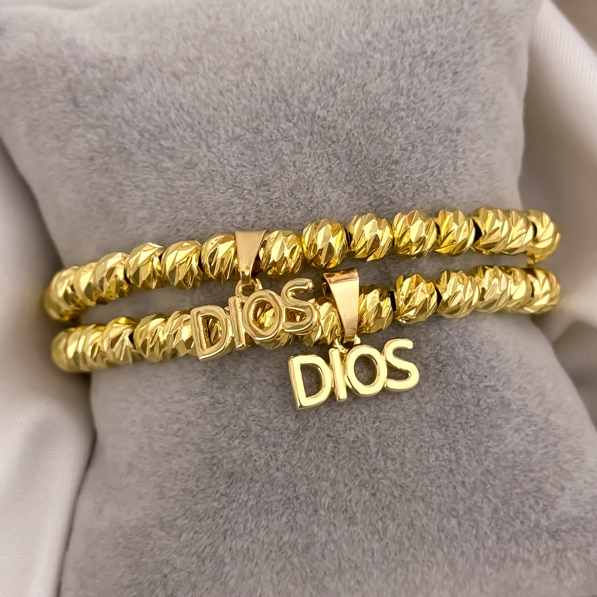Material: Oro laminado 18K premium con 8 capas de recubrimiento. Diseño: Balines lisos de 4 mm con herraje central “DIOS”. Tamaño: Pulsera dama 18 cm | Pulsera caballero 20 cm. Color: Dorado intenso, idéntico al oro macizo. Acabado: Brillo espejo de alta calidad, resistente y duradero. Unisex: Diseñado para parejas, hombres y mujeres. Método de ajuste: Elástico reforzado para máxima comodidad.