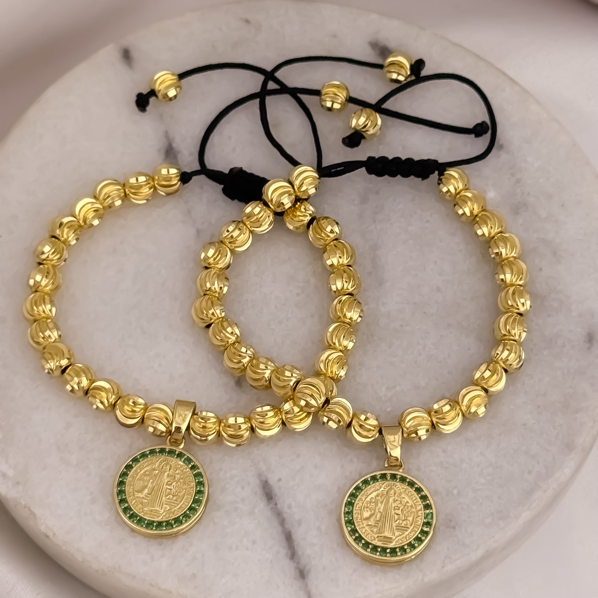 Pulseras para Parejas: Balín Italiano con San Benito Protección micro circones verde oro Laminado 18k