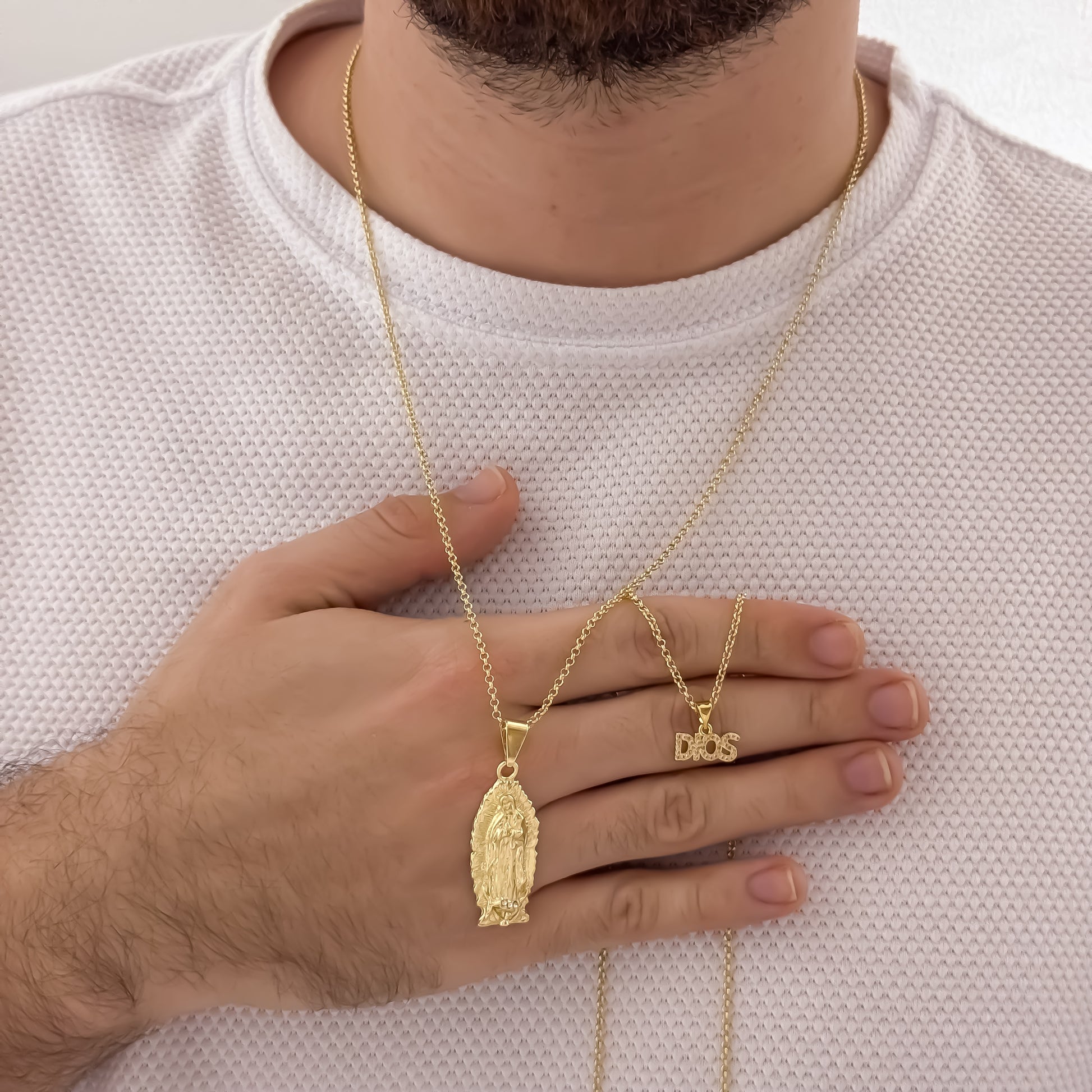 Hombre (60 cm): virgen de Guadalupe Dama (45 cm): Dije de DIOS tallada. El proceso multicapa sella el color 18K para que el brillo dure con cuidados sencillos.